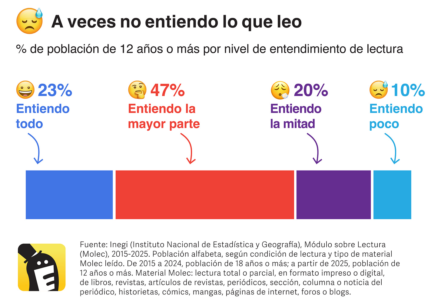 La oficina de estadística pública, el Inegi, calcula que apenas 2 de cada 10 personas en México entiende todo lo que lee; los demás tienen problemas chiquitos (47%) o muuuy serios (30%).